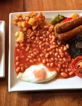 2 Cumberland sausages, 2 crisp grilled bacon, egg of your choice, Heinz beans, mushrooms, grilled tomato with rhubarb spiced potatoes and bloomer toast.